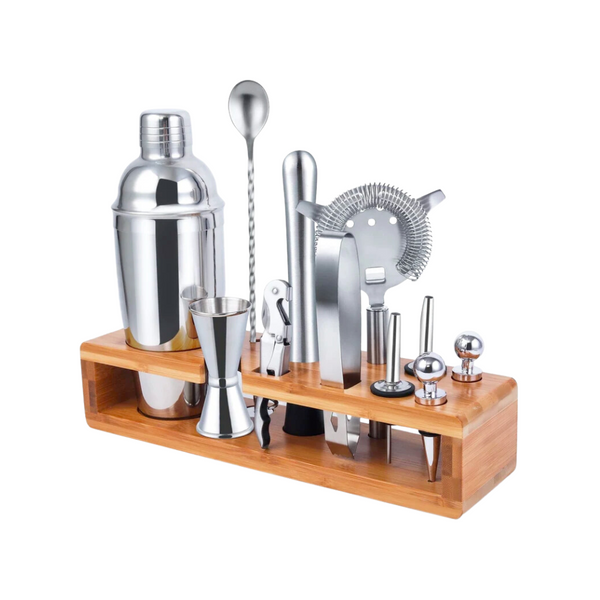- Professional Cocktail Shaker Set with Bamboo Stand and the 12-piece bartender set gives you complete basic accessories you need to make your favourite mixed drink.
